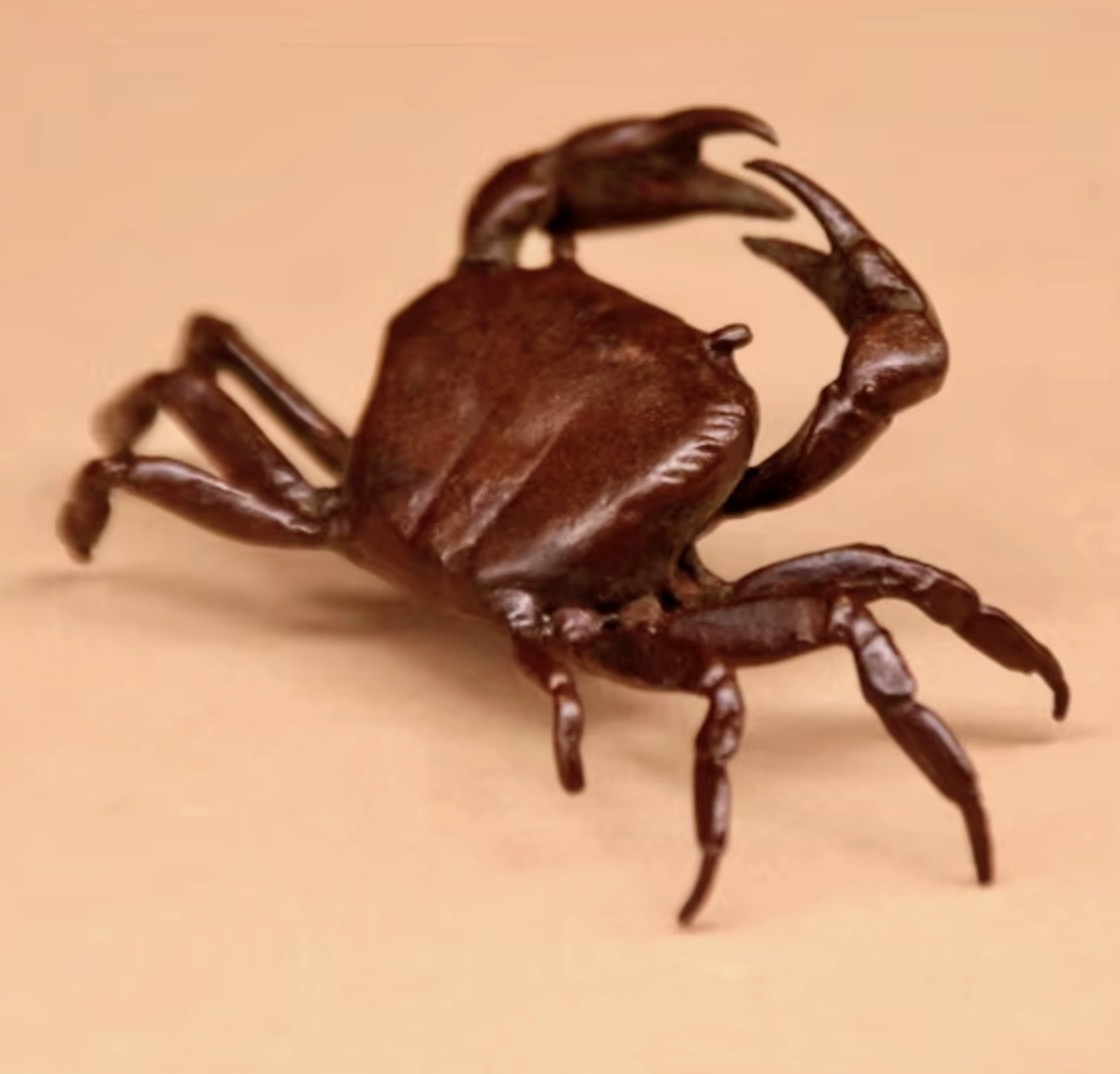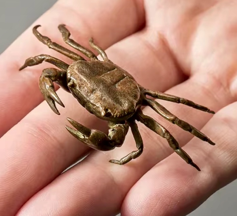 This beautifully handcrafted decorative bronze crab is a unique creation, with each piece individually cast in a foundry. The small crab measures approximately 6 cm in length and 3.5 cm in width, with a weight of about 21.4 grams. Crafted with incredible attention to detail by skilled artisans, it features a textured surface and a stunning brown-reddish patina, evoking the charm of an antique. If this piece were an original antique, obtaining this level of quality could cost you up to ten times more. The art of creating animals from bronze dates back thousands of years, originating in ancient civilizations such as Mesopotamia, Egypt, and China. Bronze, an alloy of copper and tin, became a favored medium for artisans due to its durability, malleability, and ability to capture intricate details. This versatility made it ideal for sculpting lifelike representations of animals, which often held cultural, religious, or symbolic significance.
