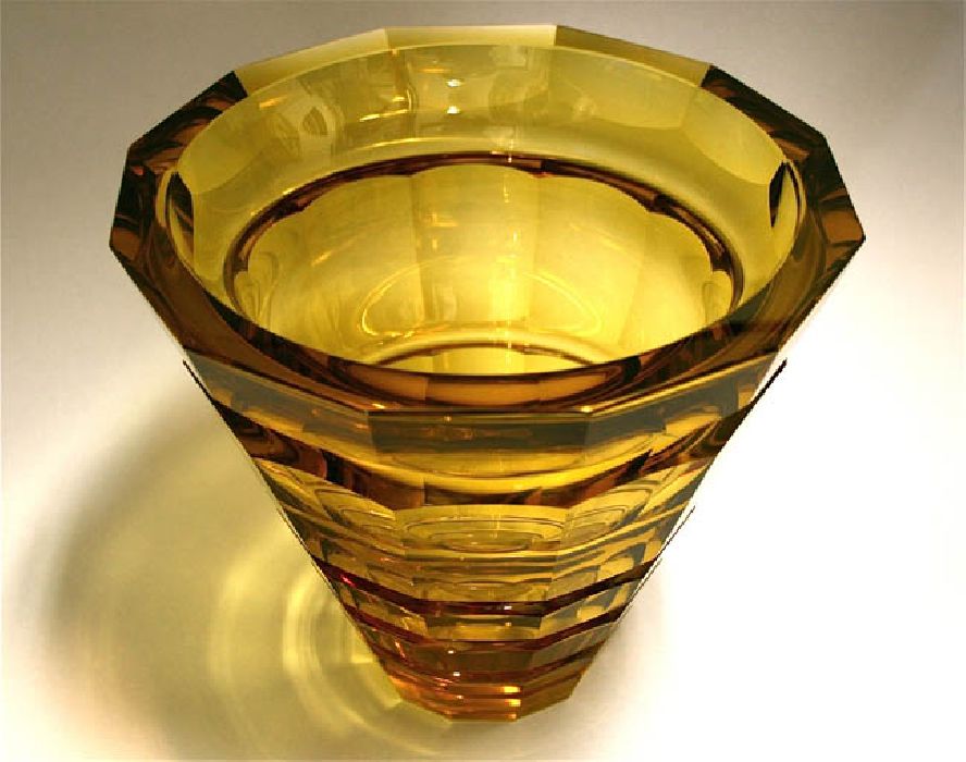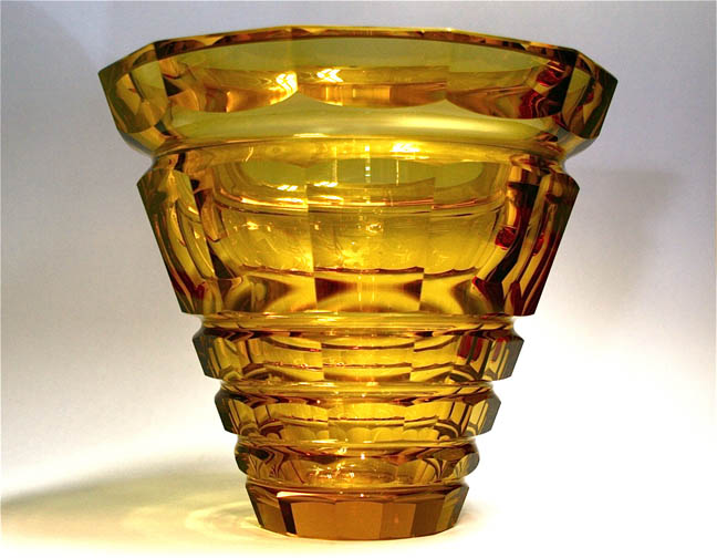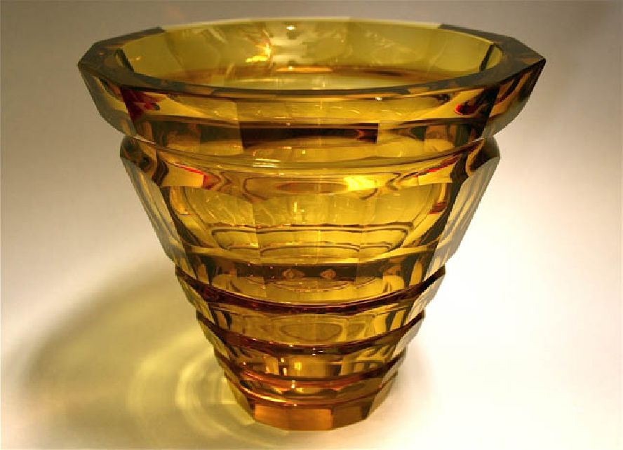 Heavy cut crystal vase in a beautiful yellow crystal glass A Bohemian Art Glass Secession era Vase. The style and cut of this vase is consistent with works produced by the Moser firm between 1925 1935. The cut glass is 1/2" thick. Condition: tiny flea bits on the flat bottom and scratches and roughness on the flat bottom consistent with use and age. This is a very heavy cut glass bowl with a great color. There are 12 cut glass sides around the bowl and 6 cut glass separations vertically up the side of the bowl.