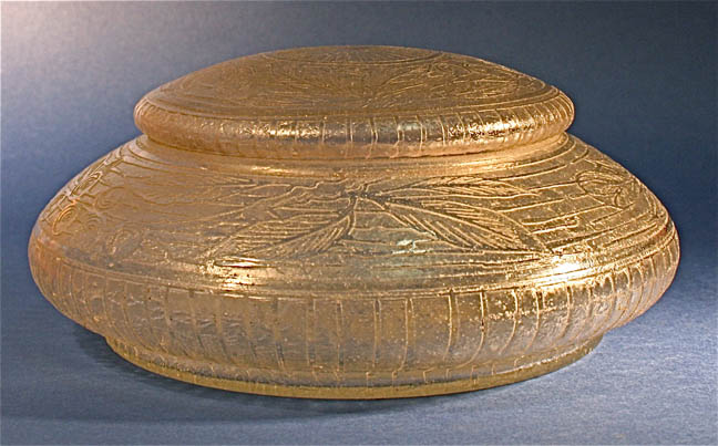 Beautiful handmade french-etched clear Glass bowl and lid. Will Instantly brighten up any living space with this stylish accent piece. This small, hand-blown bowl is made with an antiquated flowered etched design in clear glass for a three dimensional effect. Very old. Signed.