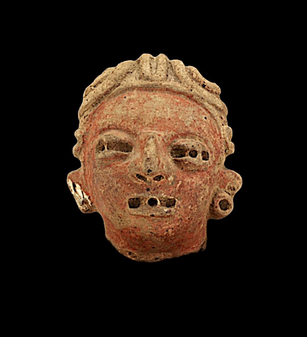 A striking Aztec-style ancient ceramic terracotta pottery ceremonial head fragment, hand-potted wit...