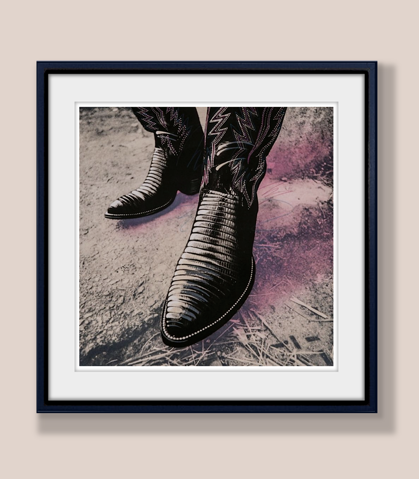This is a spectacular contemporary Mixed-media lithograph. Art Print of Cowboy Boots, Hand-Signed in Pencil by Photographer Paul Jasmin.