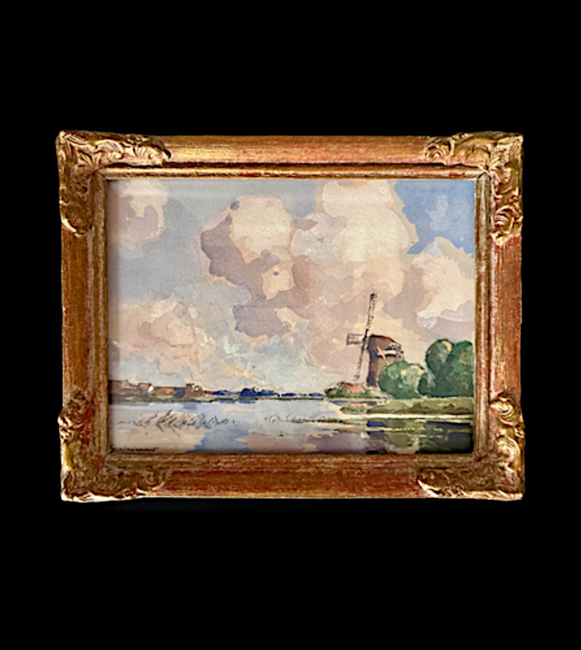 .Original Antique Dutch Landscape Watercolor Painting