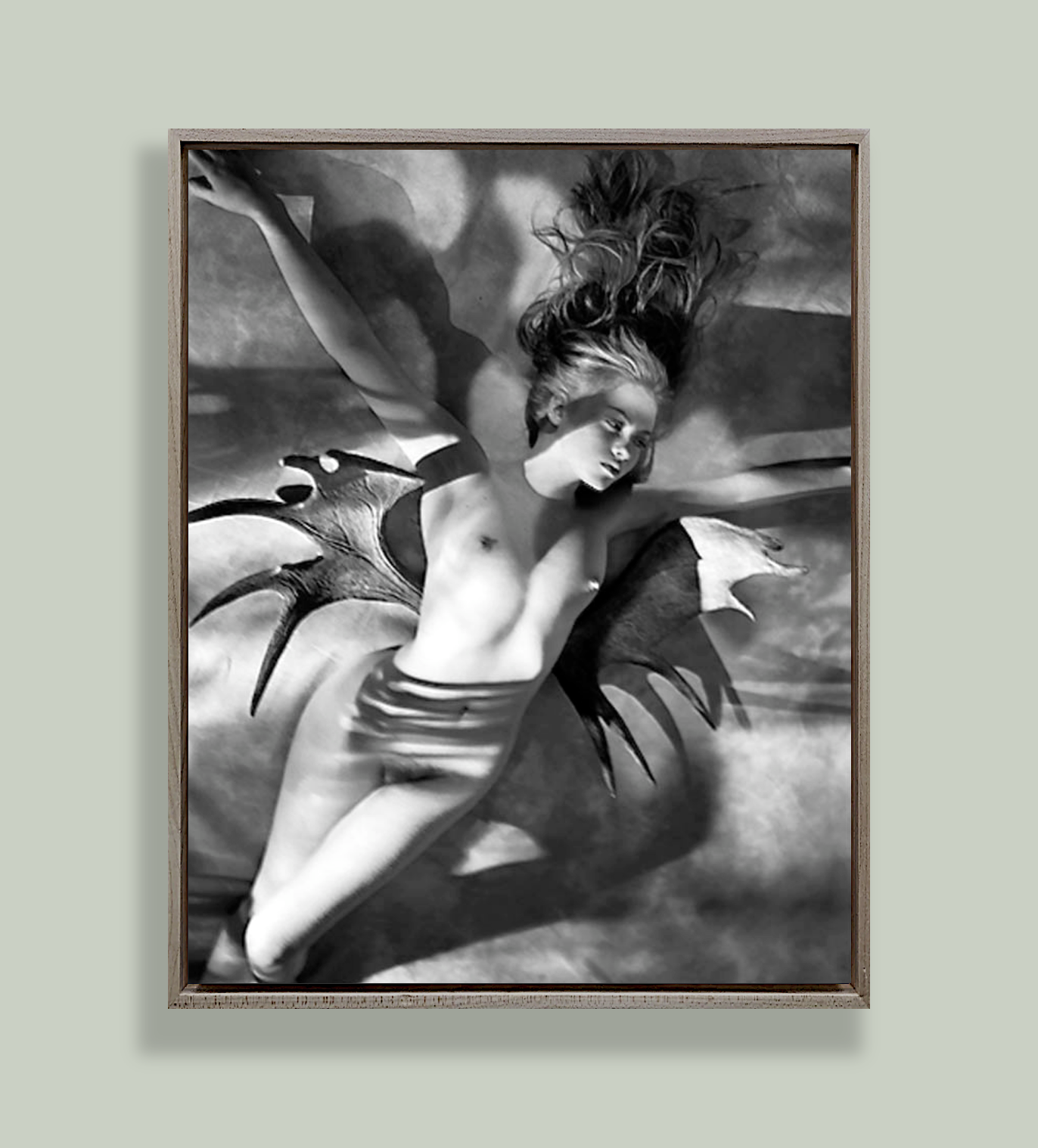 Original Photographic Poster: Art Photographer George Holz: Claire with Moose Wings, 1986. This high-quality art print poster is meticulously produced to preserve the high-contrast black and...